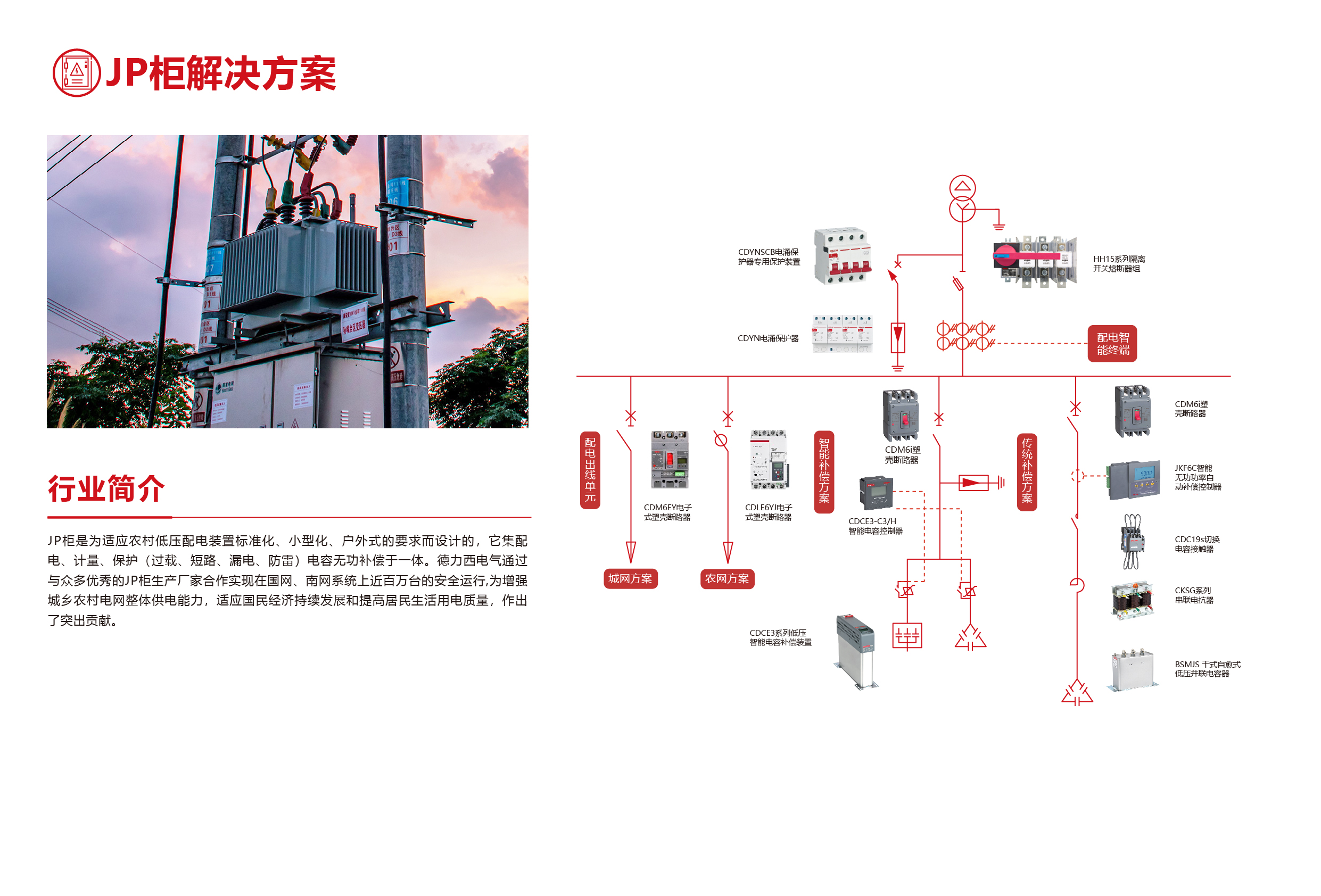 JP柜是為適應(yīng)農(nóng)村低壓配電裝置標(biāo)準(zhǔn)化、小型化、戶外式的要求而設(shè)計的,它集配電、計量、保護(過載、短路、漏電、防雷)電容無功補償于一體。德力西電氣通過與眾多優(yōu)秀的JP柜生產(chǎn)廠家合作實現(xiàn)在國網(wǎng)、南網(wǎng)系統(tǒng)上近百萬臺的安全運行,為増強城鄉(xiāng)農(nóng)村電網(wǎng)整體供電能力,適應(yīng)國民經(jīng)濟持續(xù)發(fā)展和提高居民生活用電質(zhì)量,作出了突出貢獻(xiàn)。