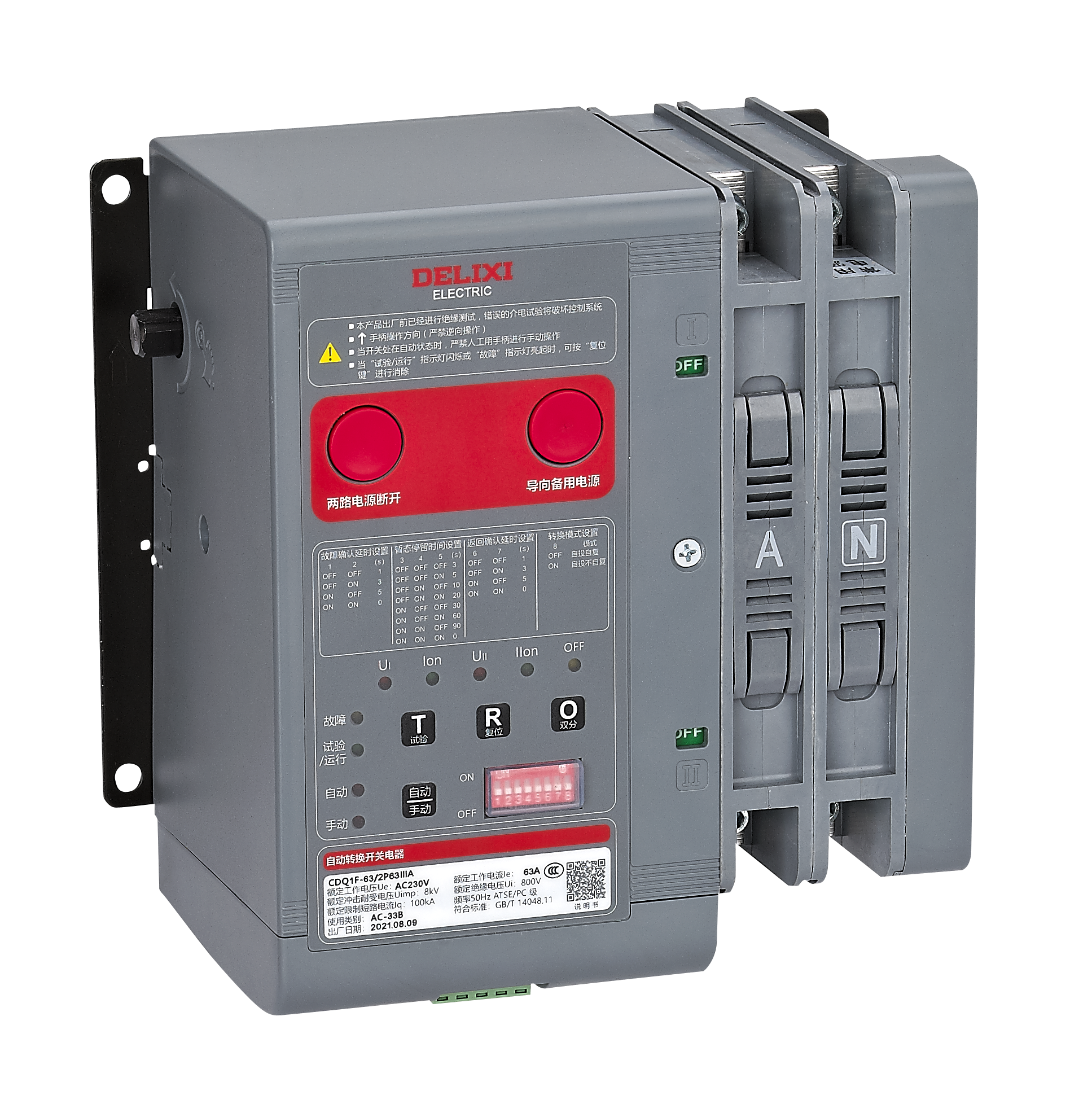 CDQ1F type PC class automatic transfer switching equipment is composed of a load disconnector (no overload and short circuit protection mechanism) and an intelligent controller. The switch adopts excitation conversion mechanism with a faster conversion speed, and can turn on/ off and carry a larger working current; furthermore, a new microcomputer control system is adopted, featuring with a more intelligent monitoring and control, strong electromagnetic compatibility, long-term continuous operation, stability and reliability. Meanwhile, the switch is equipped with LED light/LED digital tube/LCD display for simple operation and clear indication, providing users with a friendly man-machine interface.