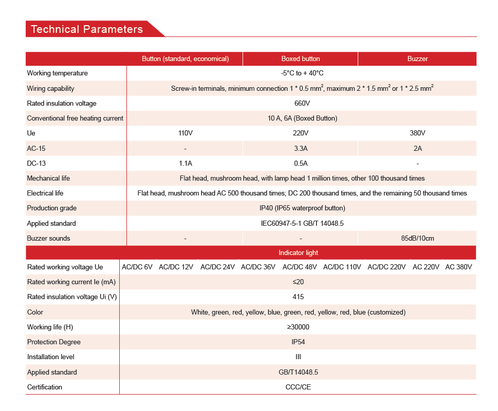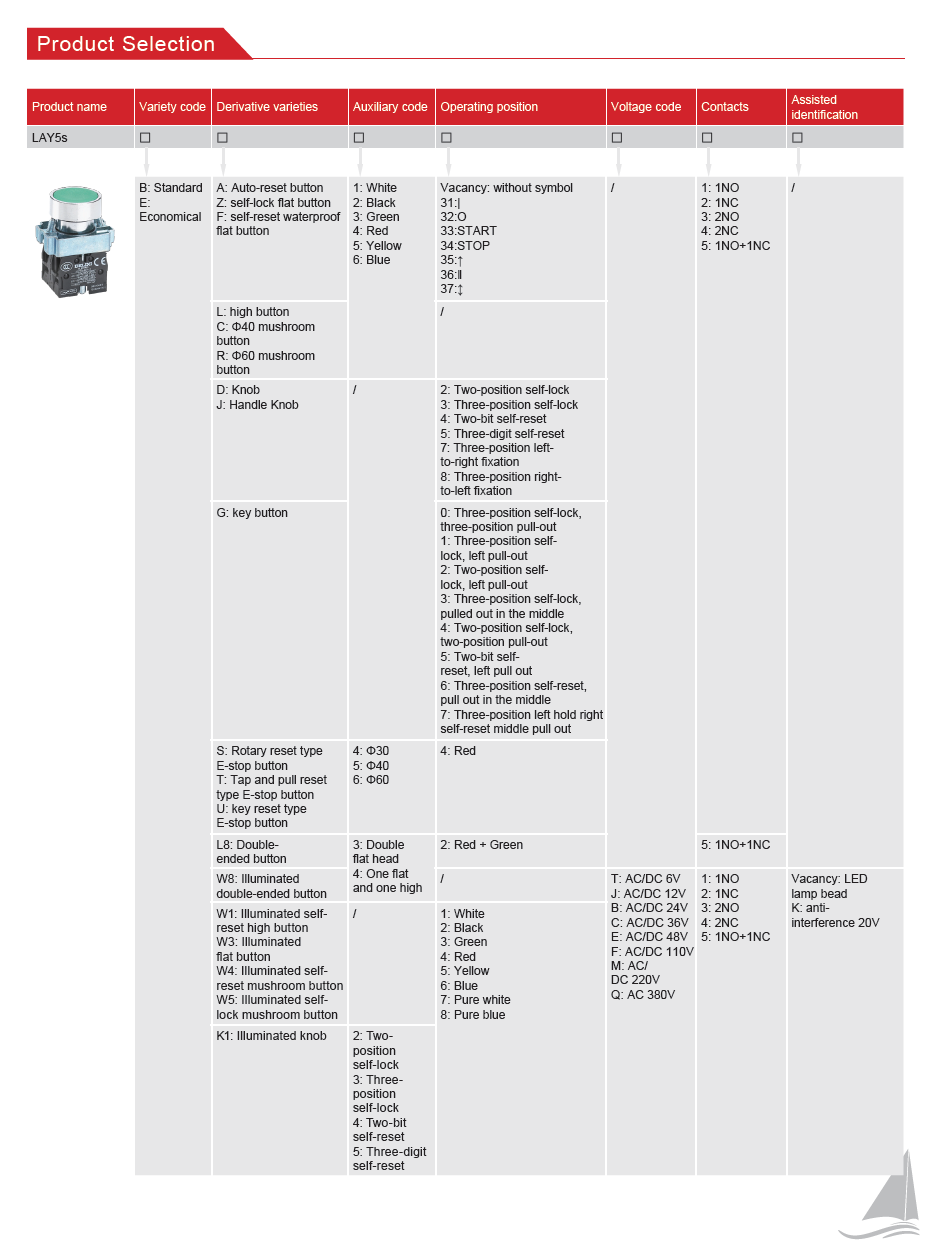 The new generation of all-star product line LAY5s - the most complete button indicator series in history, the complete LAY5s button indicator series include buttons, indicator lights, buzzers, boxed buttons and a complete range of accessory products, including buttons, contact modules, indicator signs, button boxes, light group modules and self-lock modules; With complete categories and specifications, standard buttons and economical buttons include self-reset buttons, self-lock buttons, illuminated buttons, waterproof buttons, Φ40 mushroom buttons, Φ60 mushroom buttons, double-ended buttons, rotary button, handle button, key buttons, and E-stop buttons. Up to 360 specifications in a single series facilitates one-stop procurement for customers.