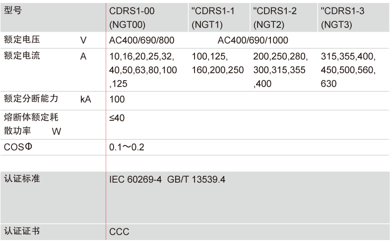 The fuse for the protection of CDRS1 (NGT) semiconductor equipment is suitable for AC 50Hz (or 60Hz) device with a rated voltage 400~1000V and below, and a rated current 10 to 630A, and it is mainly used in the semiconductor electrical equipment and the complete set of devices formed by them for short circuit or overload protection.