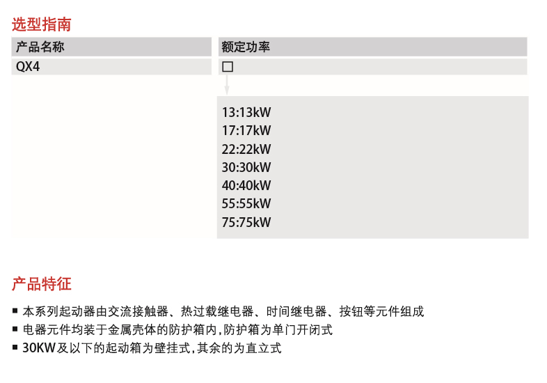 This series of starters are composed of an AC contactors, a thermal overload relays, a time relays, and a buttons. Electrical components are installed in the protective box with metal shell, the protective box is of the single-door opening and closing type, the 30KW and below starting box is of the wall-mounted type, and others are of the upright type.
