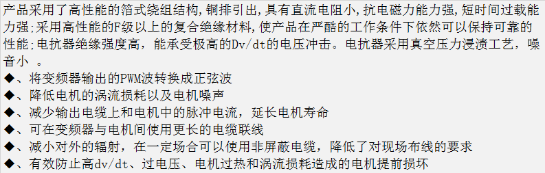 Driven by a PWM inverter, a sine wave filter can still provide a smooth sine wave at the low residual ripple voltage in the switching frequency range between 2-8kHz. In inverter drive applications, it can prevent damage to the winding insulation of the motor, reduce the resonance generated by the distributed capacitance and distributed inductance due to cable length, eliminate motor overvoltage caused by high dv/dt, eliminate the early damage to the motor caused by eddy current loss, improve the performance and life of the motor, and extend the output distance of the inverter.