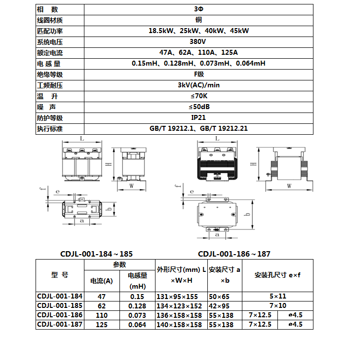 The machine tool AC reactor is designed mainly for the characteristics of machine tools as its accessory, such as CNC machine tools, inverters, and servo drives. It is used to limit the voltage drop on the grid side during the phase conversion of frequency conversion and AC device, and to suppress harmonics and decouple the parallel converter, as well as to limit the grid voltage jumps or current surges generated during the operation of grid system. The product has advantages of protection grade IP21, small size, small loss, low temperature rise, low noise, and simple installation.