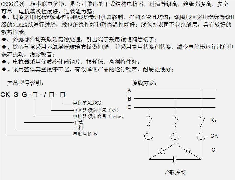 CKSG series three-phase series reactor is used in low-voltage reactive power compensation cabinet, and connected in series with capacitors to limit the closing inrush current of the capacitor in the three-phase co-compensation switching mode and to limit the external inrush current generated when a fault occurred nearby or when the adjacent capacitor is switched or to eliminate response in the power supply container to avoid the reactor from resonance with the power system. Suppress high-order harmonics and improve system power factor to prevent irreversible damage caused by capacitor accidents.