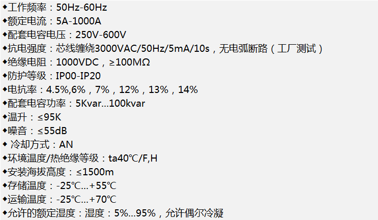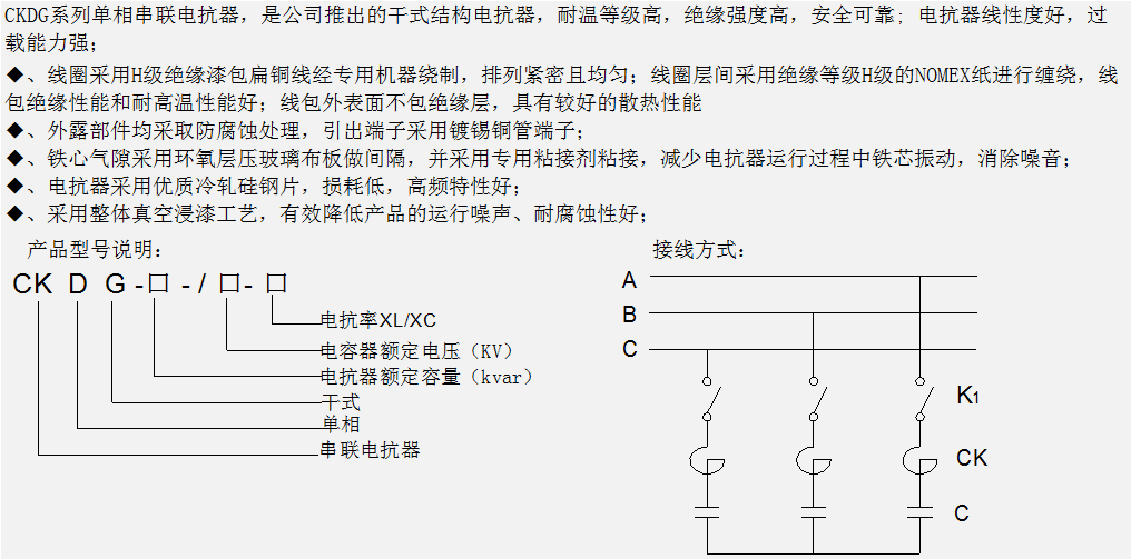 CKDG series single-phase series reactor is used in low-voltage reactive power compensation cabinet, and works in the single-phase split compensation switching operation mode. It is connected in series with a capacitor to limit the capacitor closing inrush current and to limit the external inrush current generated when a fault occurred nearby or when the adjacent capacitor is switched or to eliminate response in the power supply container to avoid the reactor from resonance with the power system. Suppress high-order harmonics and improve system power factor to prevent irreversible damage caused by capacitor accidents. Suppress high-order harmonics and improve system power factor to prevent irreversible damage caused by capacitor accidents.