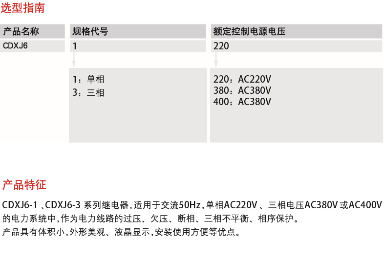 CDXJ6-1 and CDXJ6-3 relays (hereinafter referred to as relay) is used in the AC 50HZ power system with single-phase AC220V and three-phase voltage AC380V or AC400V as overvoltage, undervoltage, phase loss, three-phase imbalance, and phase sequence protection of power lines. It has the advantages of small size, artistic appearance, LCD screen, and easy installation and operation.