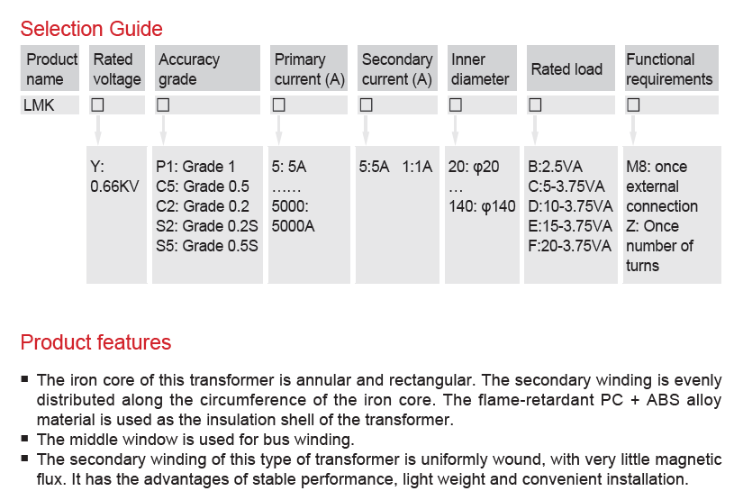 The iron core of this type of transformer is annular and rectangular core, the secondary winding is evenly distributed along the circumference of the core, and the ABS flame retardant plastic is used as the insulation shell of the transformer; there is a middle window for busbar winding; the secondary winding of this type of transformer is evenly wound with very small magnetic leakage, and has advantages of stable performance, light weight, and easy installation.