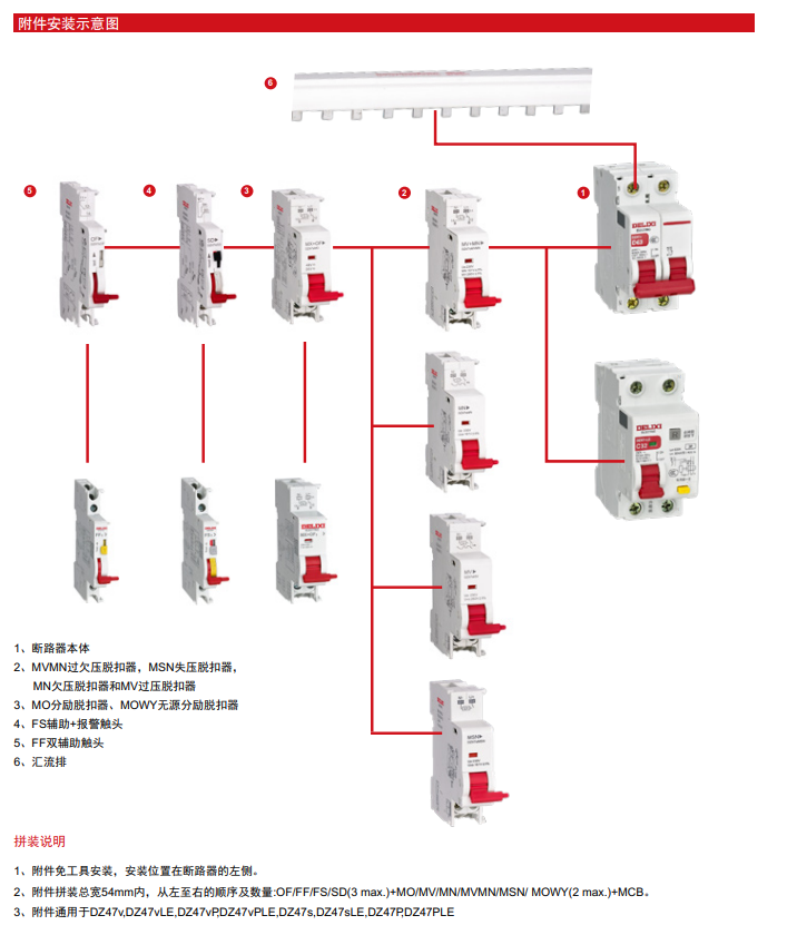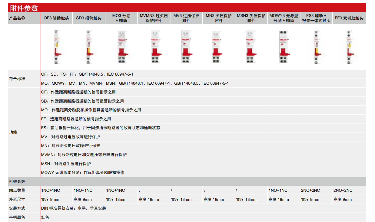 FF3 series auxiliary contacts (with 2 sets of auxiliary contacts) are mainly used in AC 50/60Hz alarm circuits with a rated voltage not exceeding 415V and a rated current 1A~6A. This series of auxiliary contacts can realize the remote opening of circuit breaker and the signal indication through the remote connection of signal lights.