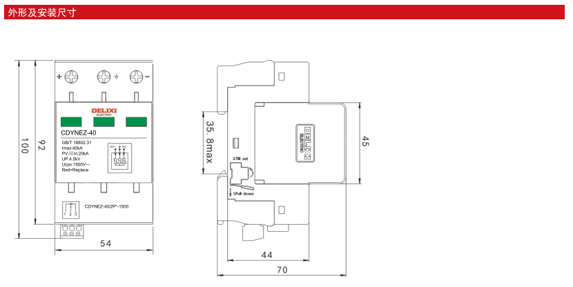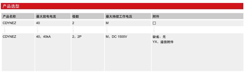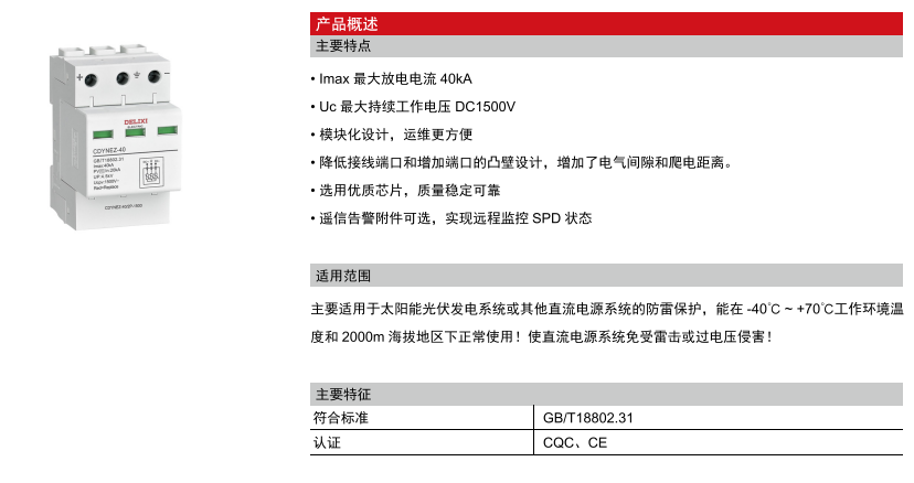 In order to meet the needs of new energy industries such as photovoltaic and energy storage, our company launched DC surge protector CDYNEZ products; this specification product has the maximum sustainable working voltage of DC1500V, and can carry up to 40kA discharge current for better guaranteeing the safety of photovoltaic storage and distribution system. The product complies with CQC, CE, RoHS (optional) requirements.