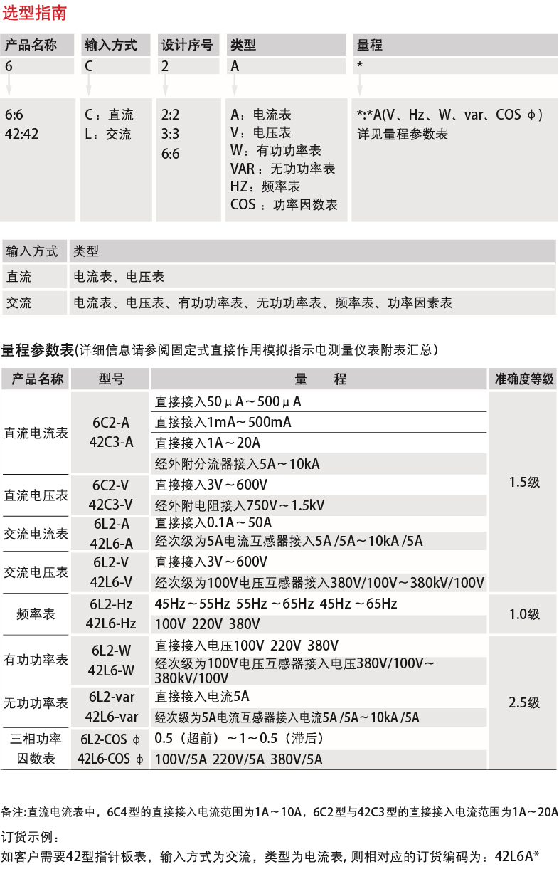 6C2, 6L2, 42C3, 42L6 fixed direct acting analog indication electrical measuring instrument can display the measured change trend, with convenient reading, and power meter and power factor meter do not require external converter; it is installed in a clamping way using the bolt tightening installation method.