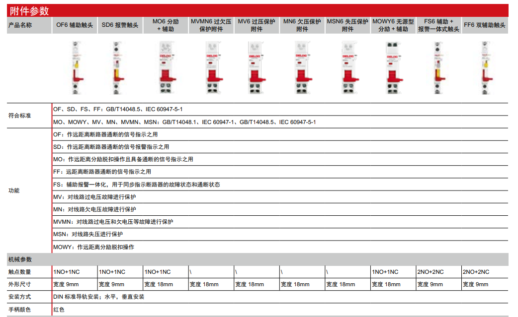 OF6 series auxiliary contacts are mainly used in AC 50/60Hz auxiliary circuits with a rated voltage not exceeding 415V and a rated current 1A~6A. This series of auxiliary contacts can remotely display the opening and closing status of the circuit breaker by remotely connecting signal lights.