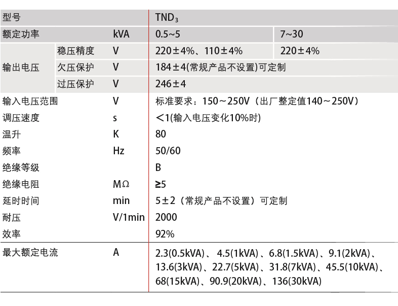 TND3 series high-precision automatic AC regulator is the company's latest generation of LCD display AC regulator. It adopts the central processing unit CPU control with data processing capacity, and features with novel appearance and stable voltage regulation process without power loss phenomenon, with high output voltage accuracy, wide input voltage range, and strong load adaptability; it has satisfactory load characteristics, with output overvoltage, overload, and temperature display protection functions, which is an ideal AC regulated power supply.