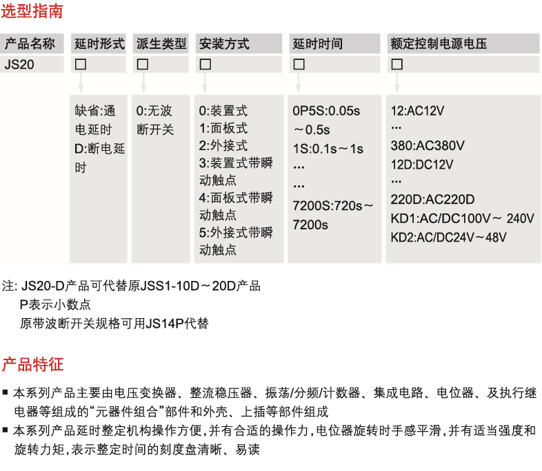This series of products mainly consist of component combination" components composed of voltage converters, rectifier regulators, oscillators/ frequency divider /counters, integrated circuits, potentiometers, and actuator relay, shell, and upper plug; This series of products delay setting mechanism is easy to operate with appropriate operating force; hands feel smooth when the potentiometer is rotating with appropriate strength and rotation moment, indicating that the setting time dial is clear and easy to read.