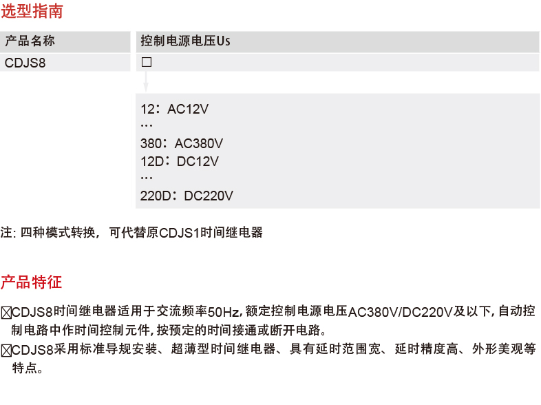 It is used in the AC 50Hz automatic control circuit with a rated control power supply voltage AC380V and below and a rated control power supply DC voltage DC220V and below as a time control element to connect or disconnect circuits according to the predetermined time.