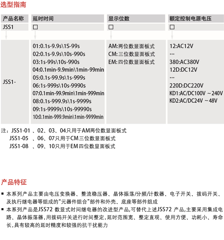 This series of products is an improved product of JSS72 digital explicit time relay, and can replace the above JSS72 product. It mainly adopts integrated circuit and crystal oscillator with the DIP switch used to time setting, featuring with wide delay range, intuitive setting, convenient operation, small power consumption, long service life, high delay accuracy and strong anti-interference ability.
