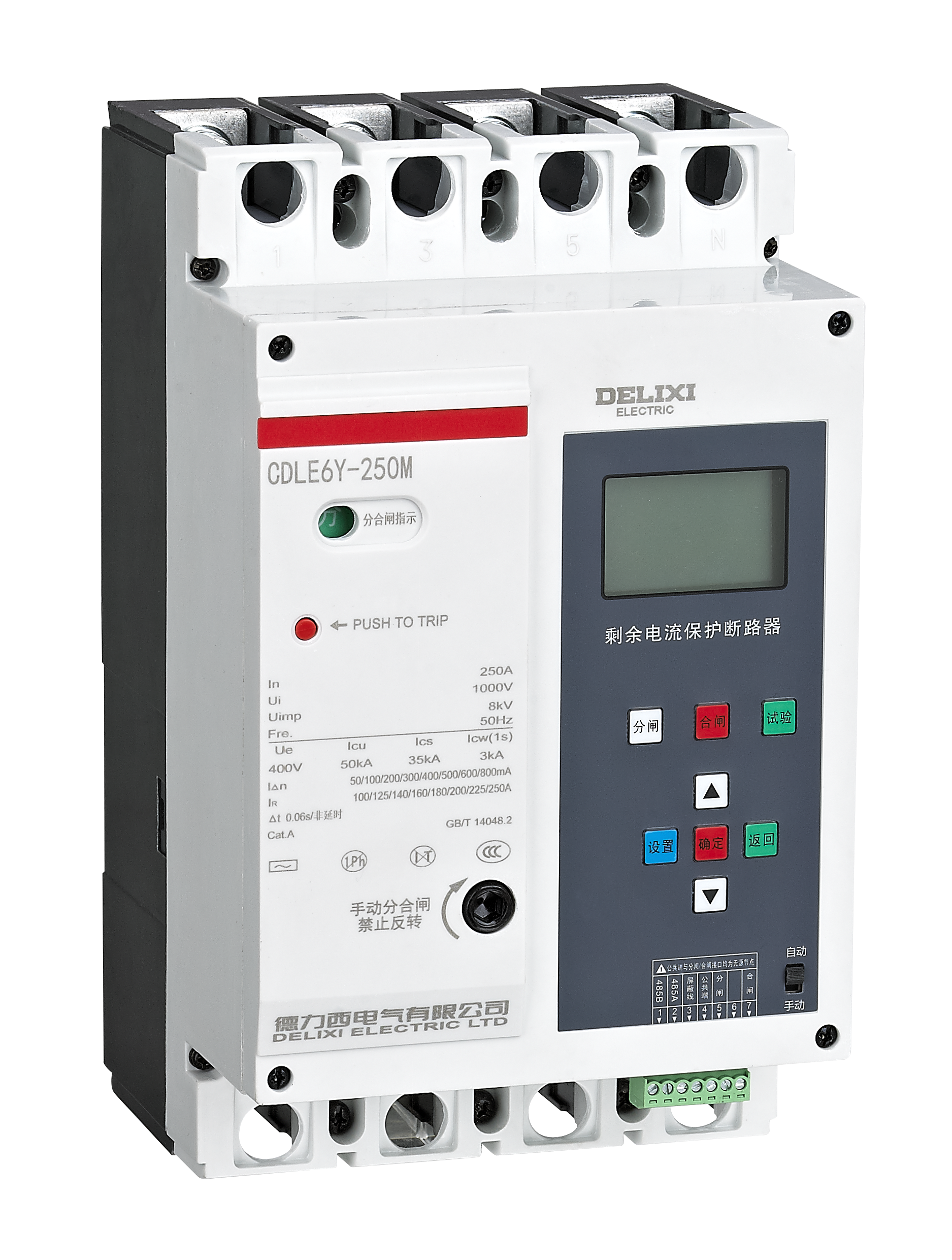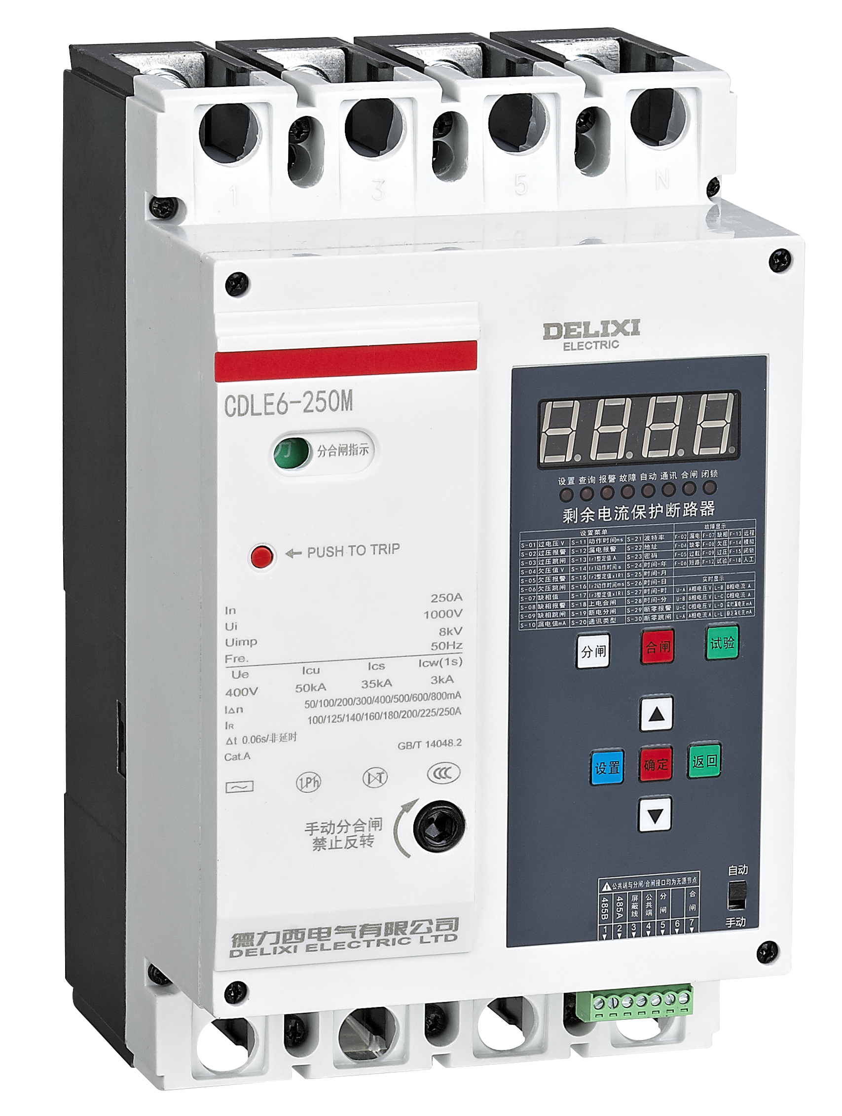 CDLE6 residual current protection circuit breaker is suitable for AC 50Hz three-phase four-wire neutral point direct grounding (TT) distribution network with a rated voltage 400V and a rated current up to 800A to provide protection against indirect contact and to prevent fire hazard caused by ground fault current due to equipment insulation damage. It is sued for electric energy distribution and for protection of lines and power equipment to prevent faults hazards such as overload, undervoltage, short circuit, and single-phase grounding. CDLE6 residual current protection circuit breaker is an integrated, multi-functional, and communicative residual current operated circuit breaker with adjustable load current in line with the intelligent requirements of smart grid management, especially suitable for comprehensive protection at all levels of urban and rural power grid, and it is the first choice for national smart grid.