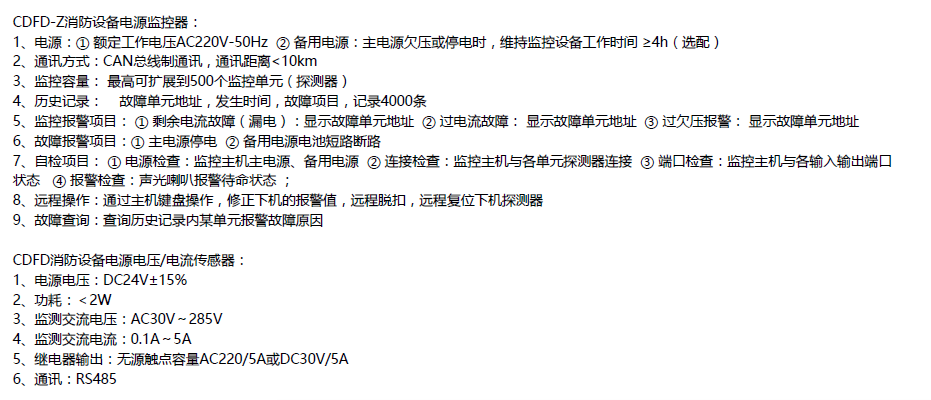 CDFD1 series fire equipment power monitoring system consists of CDFD series voltage/current sensor (hereinafter referred to as sensor) and CDFD-Z fire equipment power status monitor (hereinafter referred to as monitor). CDFD series voltage/current sensor is used for real-time detection of fire equipment power supply, and used to motor the working status of fire equipment power supply, and to detect any fault of fire equipment power supply such as interruption, overvoltage, undervoltage, overcurrent, phase loss, and short circuit in real time through data analysis. When a fault occurs, the location, type and time of the fault can be quickly displayed and recorded on the monitor, and an audible and visual alarm signal can be issued to effectively avoid the phenomenon that the fire cannot be effectively controlled and is spread due to the failure of the fire equipment in case of a fire.