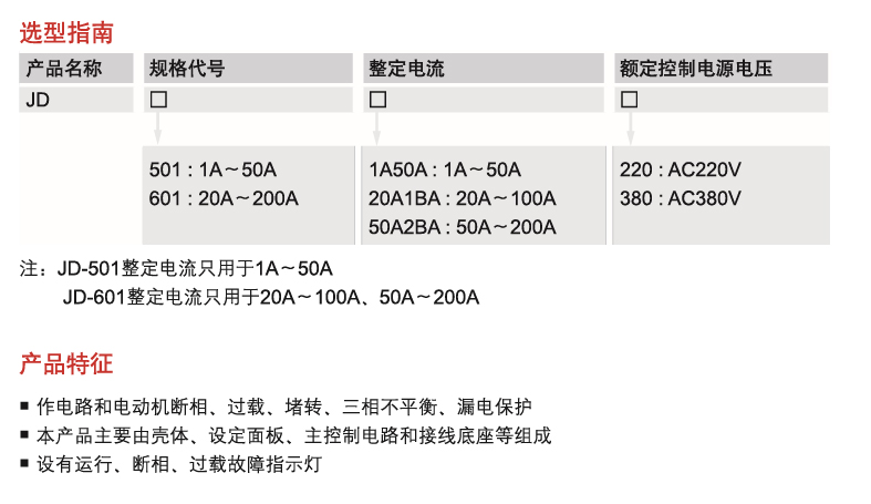 JD-501 (601) series intelligent motor protector is used as the phase loss, overload, stall, three-phase imbalance, and leakage protection of circuit and motor. This product is mainly composed of a shell, a setting panel, main control circuit and a wiring base, and has a run, phase loss, overload fault indicator.