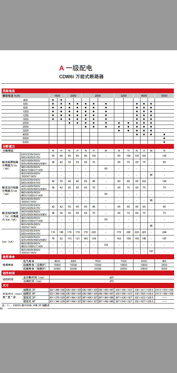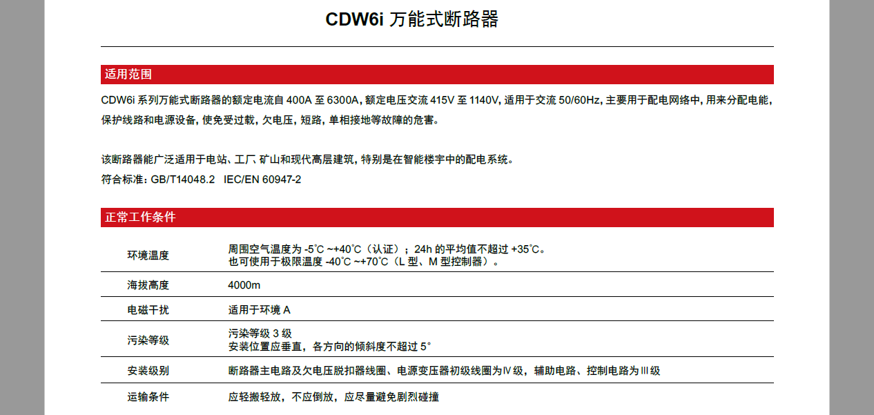 CDW6i series frame circuit breaker has a rated current ranging 400A to 6300A, and a rated operating voltage of AC 220V~1140V, suitable for AC 50Hz/60Hz, -40°C~70°C extreme environmental conditions. It is primarily used in power distribution network for the distribution of electric energy and for the protection of the lines and power supply equipment to prevent any risks caused by the faults such as overload, undervoltage, short circuit, and single-phase grounding.