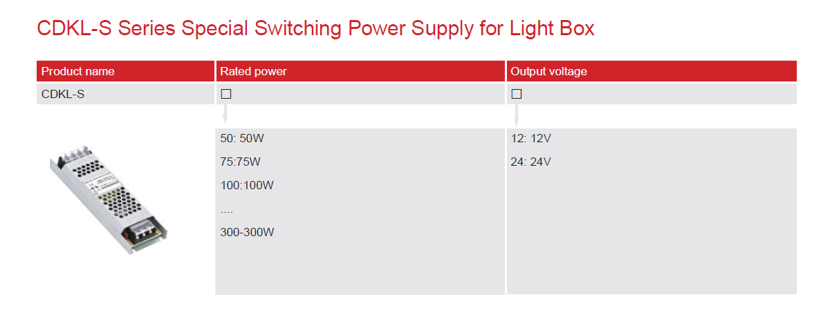 Home page >Products >Power Distribution Products >Power Supply >Universal Switching Power Supply >CDKL-S Light Box Series Switching Power Supply