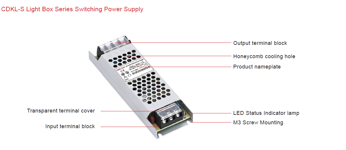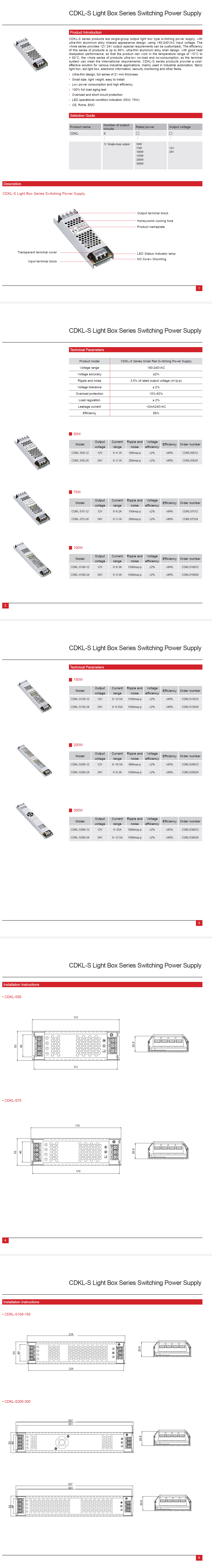 CDKL-S series products are single-output lightbox type switching power supply adopts ultra-thin aluminum alloy shell design with 180-240VAC input voltage. The whole series provides 12V 24V output (special requirements can be customized). This series of products has the efficiency up to 86%, with ultra-thin aluminum alloy shell design to ensure good heat dissipation performance, so that the product can work in the temperature range of -10℃ to +60℃; the whole series of products has ultra-low no-load and no-consumption, making the terminal system meet the international energy requirements. CDKL-S series products provide a cost-effective solution for various industrial applications, and it is mainly used in industrial automation, Kabu light box, LED light box, electronic information, and security monitoring.