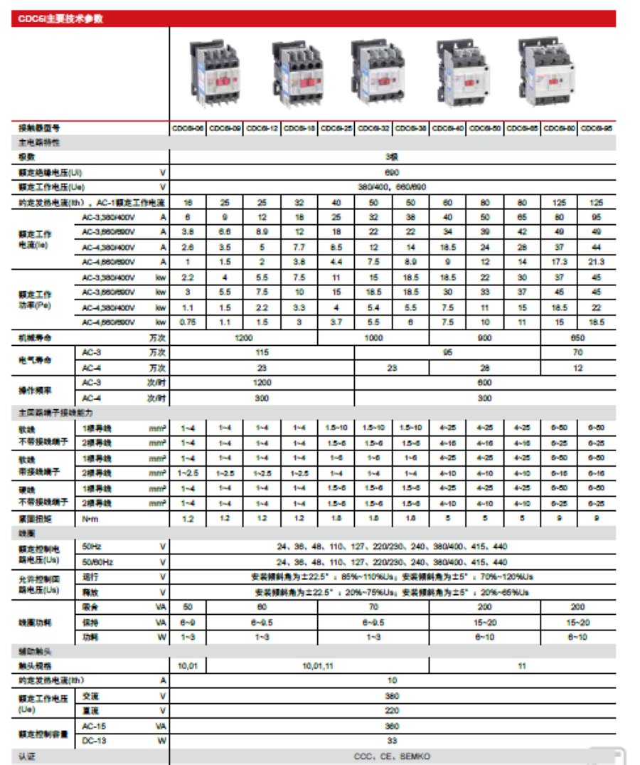 It is suitable for AC 50Hz/60Hz power system with a rated working voltage up to 690V, and a rated operating current up to 95A at the rated operating voltage 380V under the AC-3 use category for remote connection and disconnection of circuit. It is recommended to combine with the CDR6i thermal overload relay to form an electromagnetic starter to protect circuits where may be overloaded.