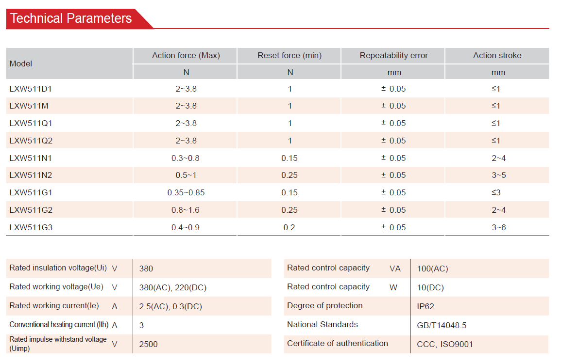 It is suitable for AC 50Hz~60Hz control lines with a voltage up to 380V and a DC voltage up to 220V for travel control protection and interlocking of mechanical equipment such as machinery, textiles, and electronic instruments.