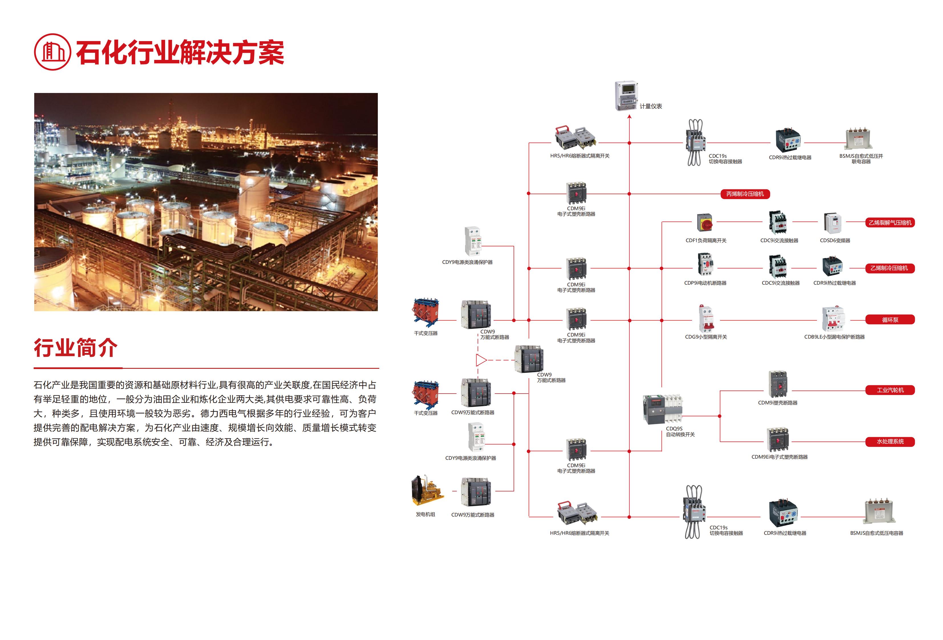 石化產(chǎn)業(yè)是我國重要的資源和基礎(chǔ)原材料行業(yè),具有很高的產(chǎn)業(yè)關(guān)聯(lián)度,在國民經(jīng)濟中占有舉足輕重的地位,一般分為油田企業(yè)和煉化企業(yè)兩大類,其供電要求可靠性高、負(fù)荷大,種類多,且使用環(huán)境一般較為惡劣。德力西電氣根據(jù)多年的行業(yè)經(jīng)驗,可為客戶提供完善的配電解決方案,為石化產(chǎn)業(yè)由速度、規(guī)模増長向效能、質(zhì)量増長模式轉(zhuǎn)變提供可靠保障,實現(xiàn)配電系統(tǒng)安全、可靠、經(jīng)濟及合理運行。