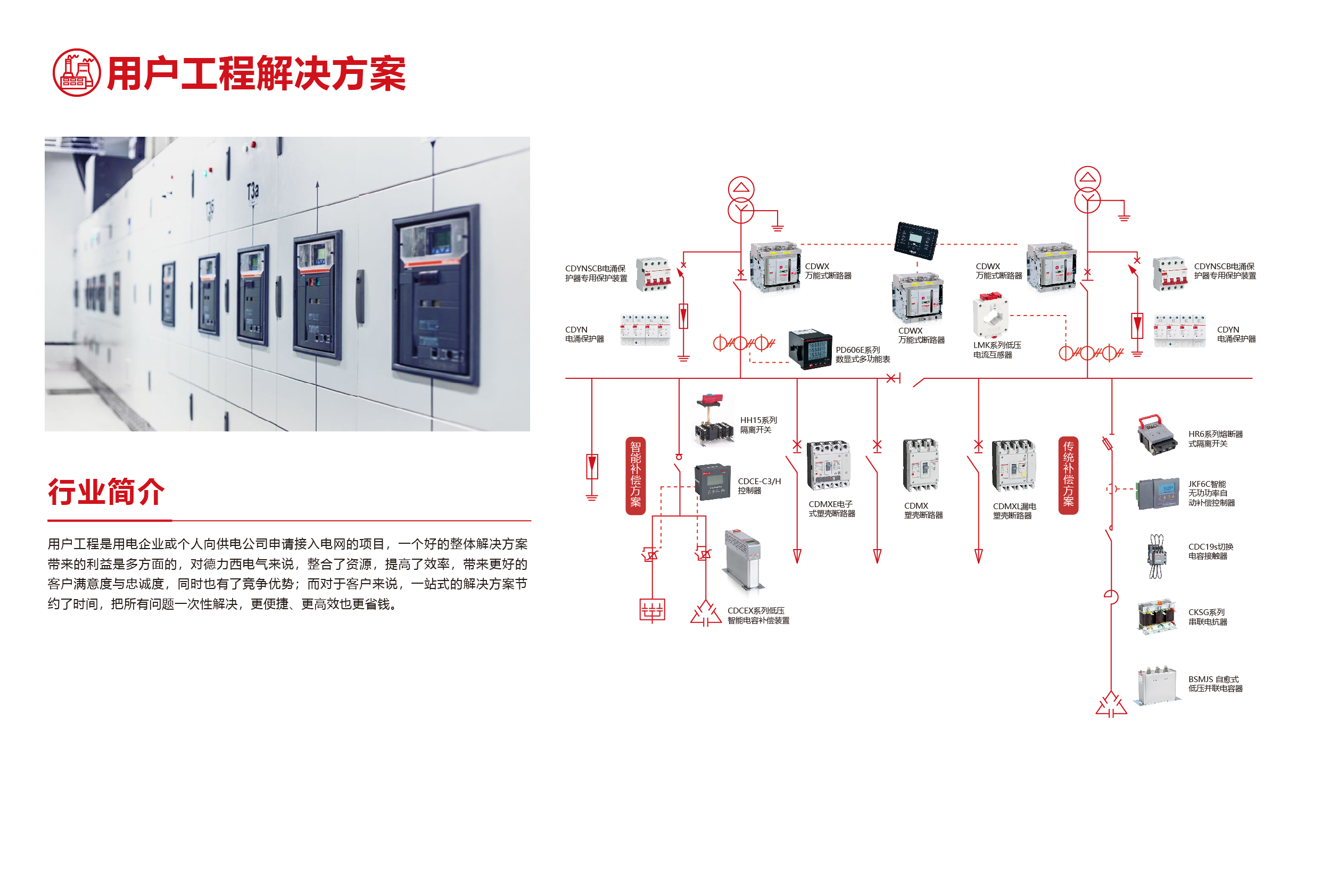 用戶工程是用電企業(yè)或個(gè)人向供電公司申請接入電網(wǎng)的項(xiàng)目,一個(gè)好的整體解決方案帶來的利益是多方面的,對德力西電氣來說,整合了資源,提高了效率,帶來更好的客戶滿意度與忠誠度,同時(shí)也有了競爭優(yōu)勢;而對于客戶來說,一站式的解決方案節(jié)約了時(shí)間,把所有的問題一次性解決,更便捷、更高效也更省錢。