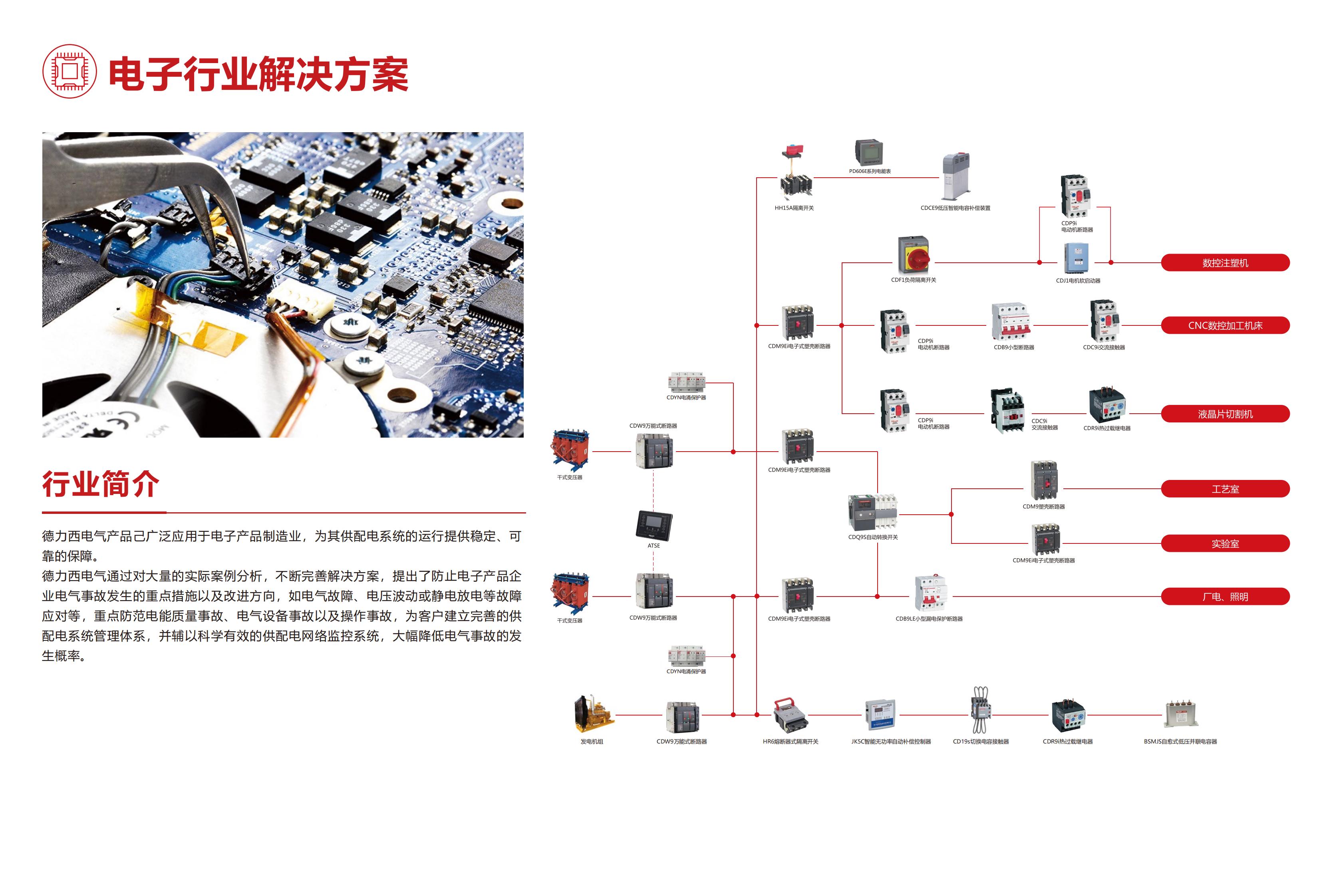 德力西電氣產(chǎn)品已廣泛應(yīng)用于電子產(chǎn)品制造業(yè),為其供配電系統(tǒng)穩(wěn)定、可靠的運(yùn)行提供可靠保障。德力西電氣通過對(duì)大量的實(shí)際案例分析,不斷完善解決方案,提出了防止電子產(chǎn)品企業(yè)電氣事故發(fā)生的重點(diǎn)措施以及改進(jìn)方向,如電氣故障、電壓波動(dòng)或靜電放電等故障應(yīng)對(duì)等,重點(diǎn)防范電能質(zhì)量事故、電氣設(shè)備事故以及操作事故,為客戶建立完善的供配電系統(tǒng)管理體系,并輔以科學(xué)有效的供配電網(wǎng)絡(luò)監(jiān)控系統(tǒng),大幅降低電氣事故的發(fā)生概率,提高企業(yè)供配電系統(tǒng)可靠、穩(wěn)定運(yùn)行。