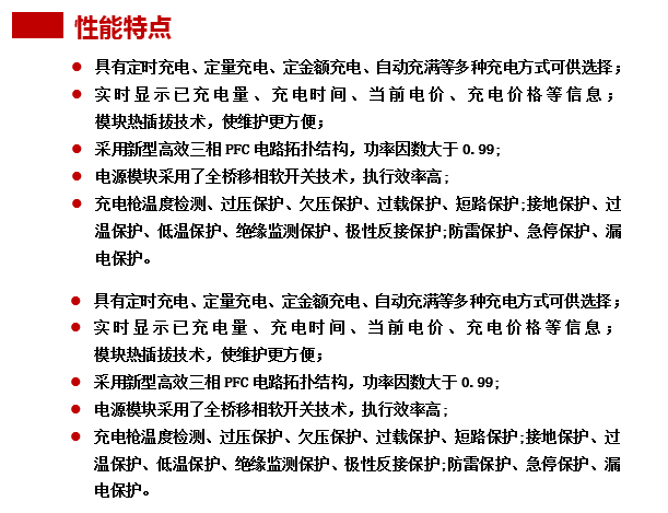 本產(chǎn)品是一體式直流充電樁,主要用于電動(dòng)汽車直流快速充電,產(chǎn)品集功率變換、充電控制、人機(jī)交互控制、通訊、計(jì)費(fèi)計(jì)量等于一體,具有良好的防塵、防水功能,防護(hù)等級(jí)達(dá)到IP54,可在室內(nèi)(室外需配防雨棚)安全的運(yùn)營和維護(hù)。充電樁的功率變換單元遵循模塊化設(shè)計(jì)原則,可以靈活配置成30kW 到 240kW 的功率輸出,滿足不同容量的電動(dòng)汽車充電需求,產(chǎn)品系列涵蓋了單槍輸出、雙槍輪充、均充模式,是快速直流充電的最佳選擇。